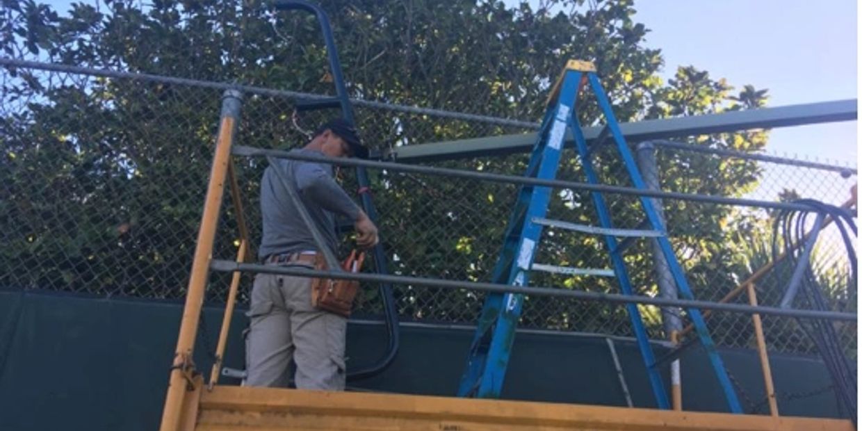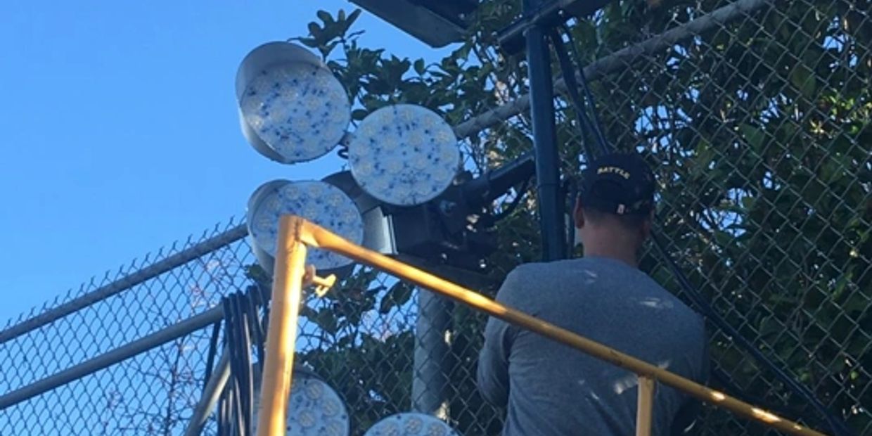 Mr. Dimacali, remarkably, had a background as a master electrician, and had an in-house crew assembled for the installation. The process of installation was a complicated one, as heavy lifts could not be used on the Plexicushon court system. Mr. Dimacali built mobile scaffolding for the project which would include modifying the pole tops to accept additional LED fixture heads with slip-fitter brackets.